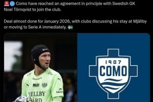 体育资讯8月25日讯 据知名转会专家罗马诺报道,科莫已经与瑞典门将诺埃尔-托尔奎斯特达成原则性一致。